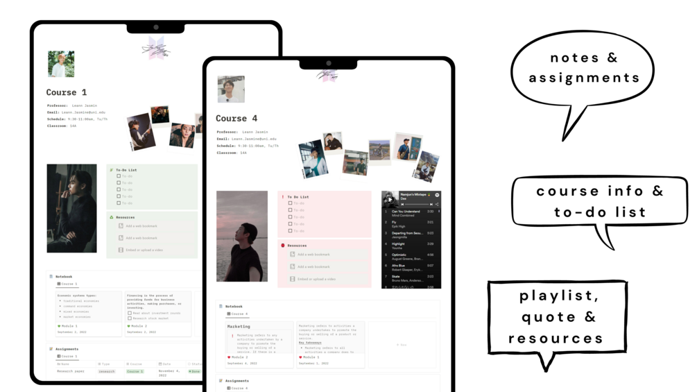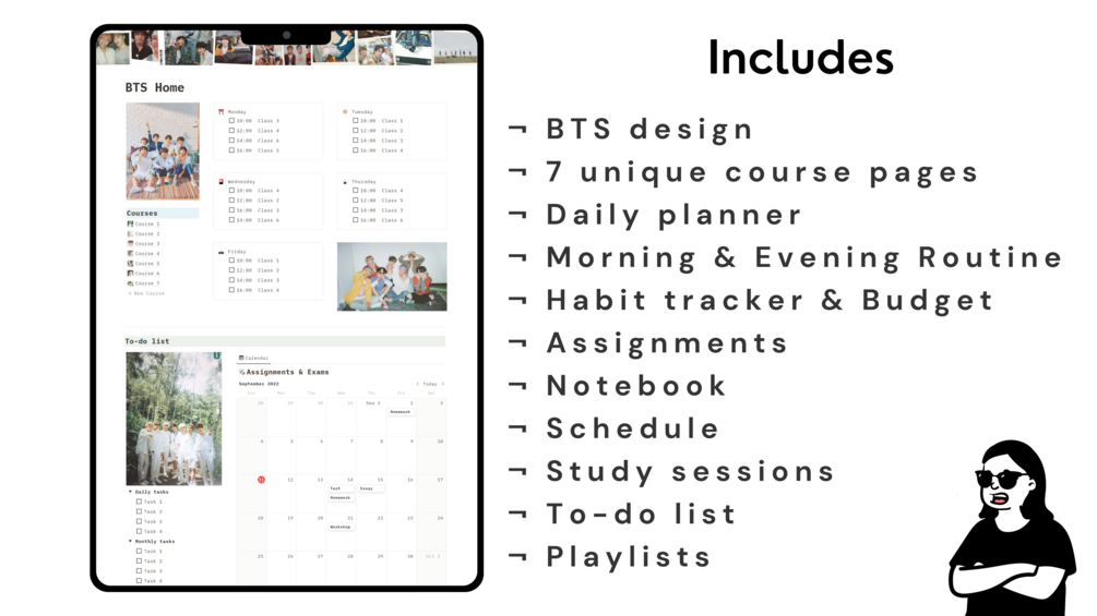 Get organized with the BTS Notion template It's perfect for capturing your schedule and keeping track of assignments and your healthy habits. Use it to take charge of your schedule, create a to-do list, and make a plan for your success.