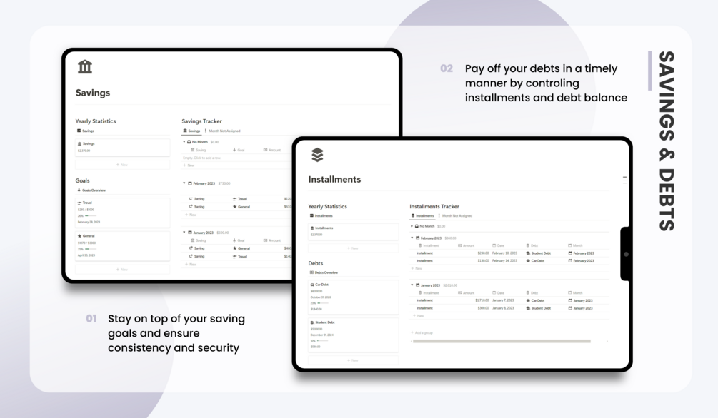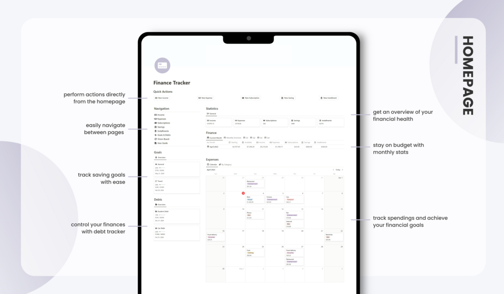 Gain a detailed understanding around your spending habits to make informed financial decisions for the future. Our Finance Tracker helps you set realistic savings goals, ensuring that you stay motivated and on track. Empower yourself to achieve financial freedom with confidence.