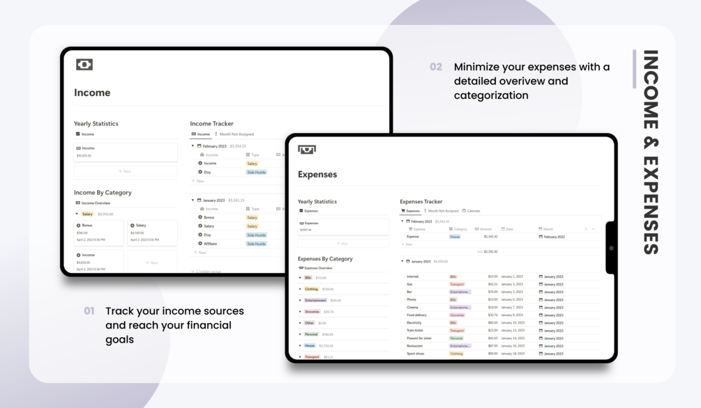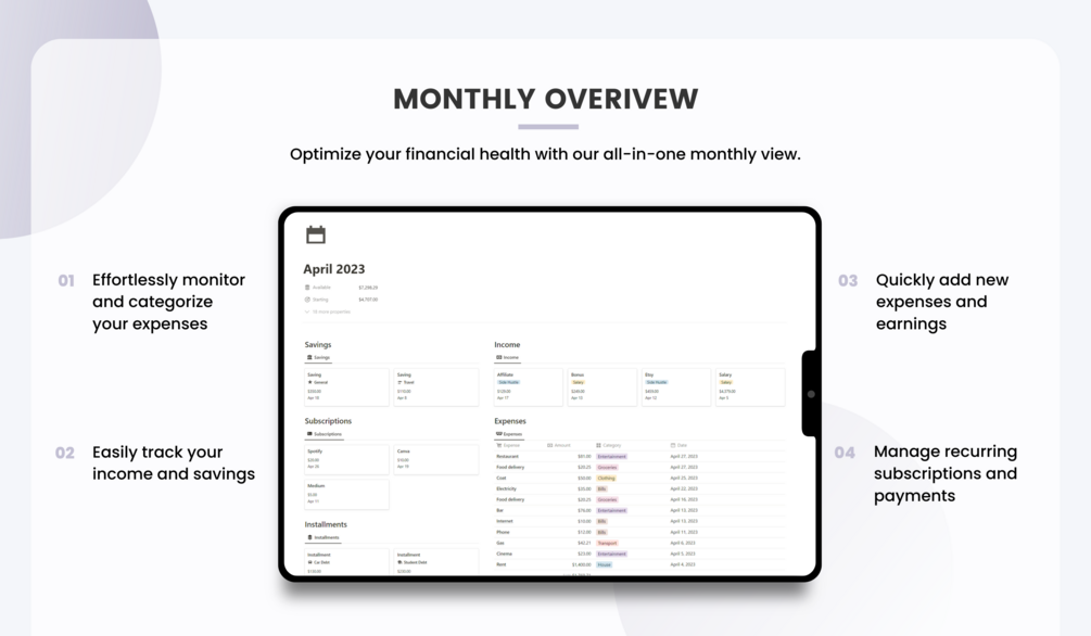 Take control of your spending habits by categorizing and tracking your expenses. Maintain a balanced budget and make informed financial decisions. -